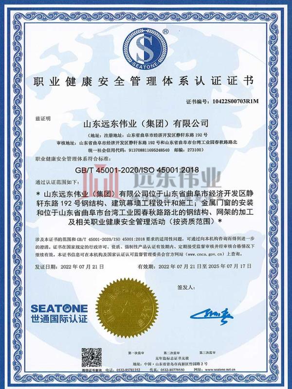 職業(yè)健康安全管理體系認證證書 2023-09-13 09:25:44 上一條:重合同守信用企業(yè) 下一條: 環(huán)境管理體系認證證書 相關(guān)資訊 夯實基礎(chǔ)·砥礪奮進 | 重慶龍... 正在施工的和新承接的項目情... 近年完成的類似項目情況表... 關(guān)于加強項目部農(nóng)民工工資支... 熱門推薦 黃海明珠中心 濟寧運河城 開發(fā)區(qū)萬達廣場 中國重汽濟寧商用車有限公司